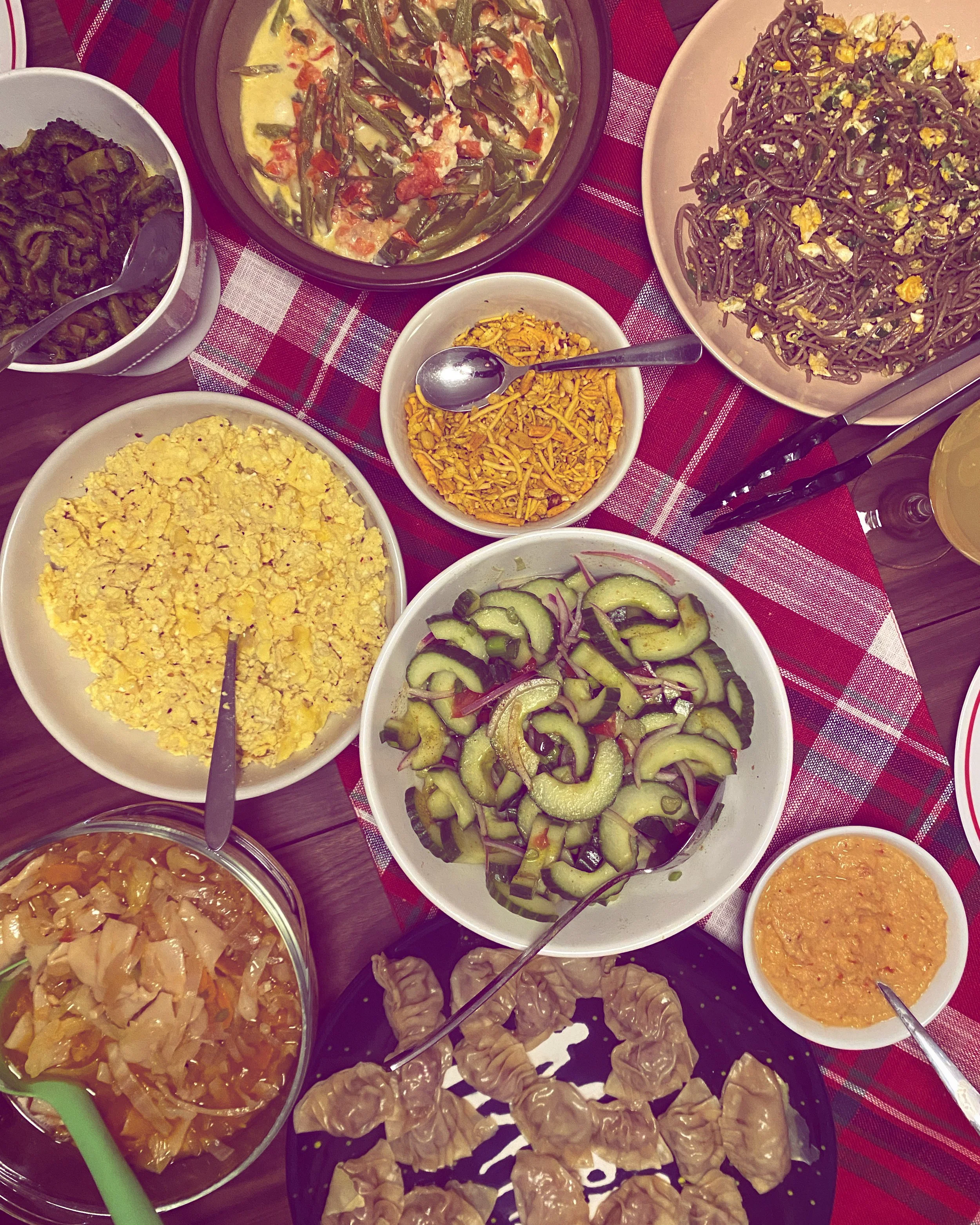 Ritee - Ema Datshi (chilies and cheese), Khatem (bitter melon), and Goen Hogay (cucumber salad)